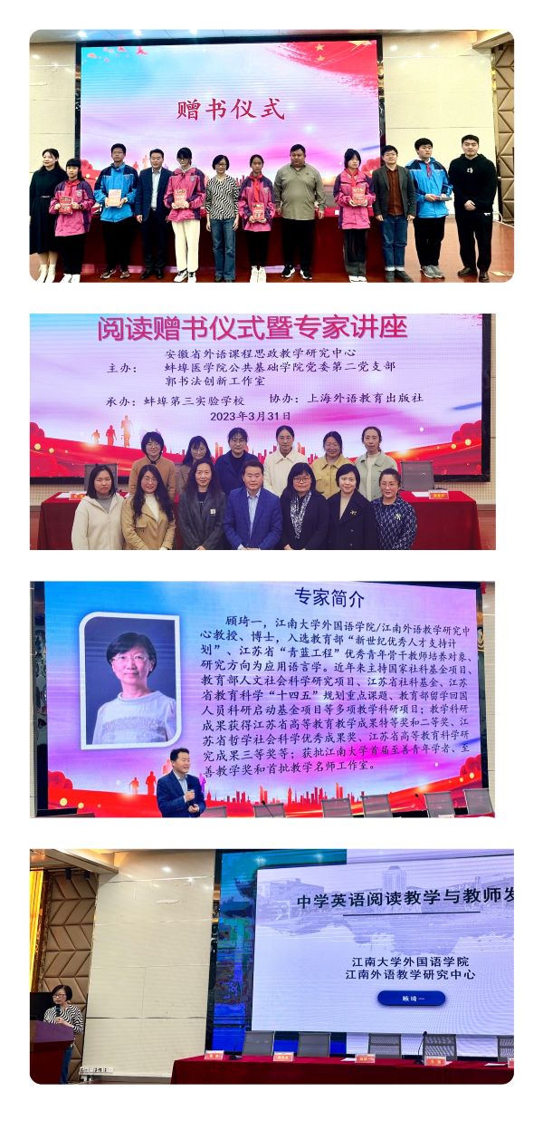3月31日下午,安徽省外语课程思政教学研究中心联合公共基础学院党委第二支部主办的赠书送学暨专家讲座活动在蚌埠第三实验学校举行。此次赠书送学进校园是第二支部主题党日系列活动之一,支部党员和外文教研室部分教师参加了此项活动。