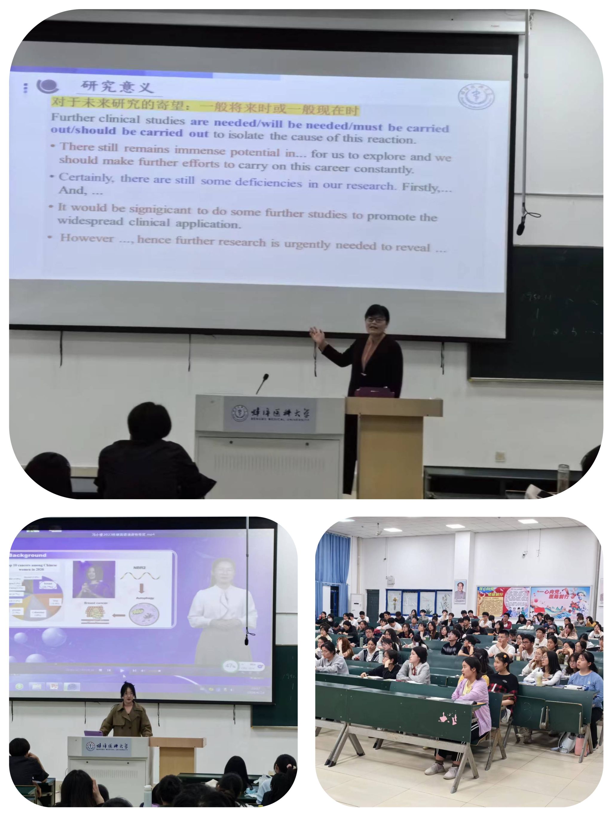 为发挥省级样板党支部示范带动作用,推动基层党建和基层教学组织相促相融,同时帮助我校学生在国家级赛事中充分展示他们的英语风采, 4月24日晚,由公共基础学院主办,外文教研室、公共基础学院党委第二党支部和郭书法创新工作室联合承办的 “中国大学生5分钟科研英语演讲”专题辅导讲座在理论教学楼T4教室如期举行。来自全校各院系两百余名学生聆听了此场讲座。讲座由公共基础学院党委第二党支部夏娟副教授和临床医学院2021级临床医学专业“2023年中国大学生5分钟科研英语演讲大赛”全国特等奖获得者冯小睿同学联合主讲。