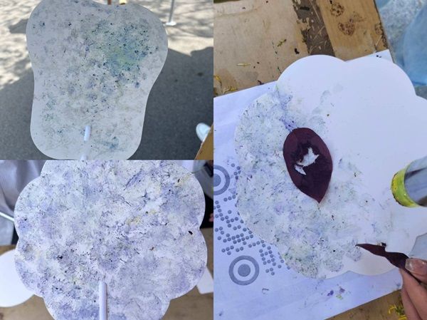 活动当天,同学们表现出了极大的参与热情,通过寻找自己喜爱的植物,并进行大胆的配色,通过小锤敲击使植物的汁液渗入书签及团扇中,制作出了各种独一无二、形态各异的书签及团扇,展现出无限的生机与活力。在织物上留下属于大自然最原始的色泽、形状和脉络纹理,一株草一束花一块布,敲拓到一起,使生命得到了延续,使文化沁润人心。制作结束后,同学们纷纷打卡拍照,为生命留相。