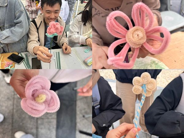 此次活动分为两个部分,第一部分是通过线上转发描写春日的诗句,增进学生之间有文化交流;第二部分是现场活动,参与同学可利用活动现场的绒质花——“扭花、巧手、造趣”。活动中,志愿者们用热情的笑容和耐心的讲解迎接每一位同学,同学们积极踊跃,用优美的诗句描绘了春天的美好,用灵巧的双手编织了春天的美景。现场气氛活跃,参加的同学络绎不绝。