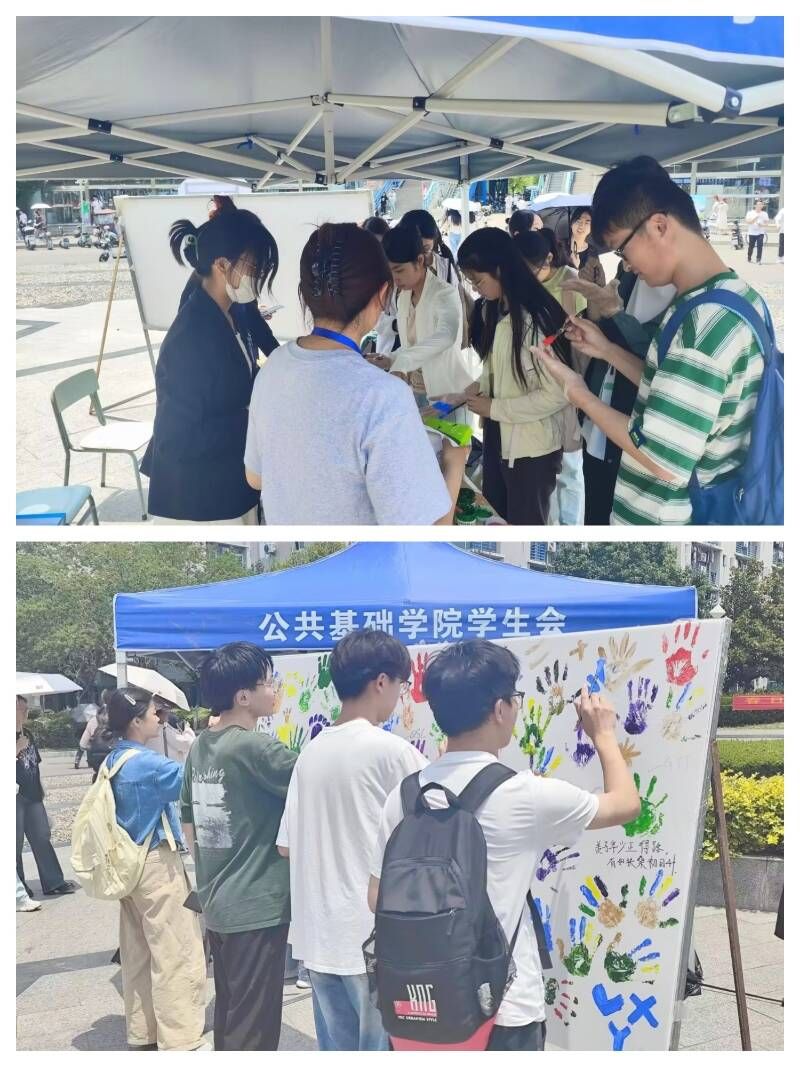 5月22日,学院开展“追忆觉醒青春,共赴无限未来 ”专题活动。活动以掌印为媒,抒青年之志,旨在传承弘扬五四精神,营造青年积极向上的氛围。活动开始后,前来了解活动规则的同学络绎不绝,现场气氛十分活跃。同学们在画布上用不同颜色的颜料描出自己的手掌形状并签下姓名,完成纸上“击掌 ”。击掌后,同学们还可以用画笔在画布上分享一直以来鼓舞自己奋斗前进的语句。而在拼图接力活动中,同学们接力完成一整块天安门拼图,沿着革命先烈的足迹,重温历史。
