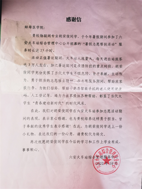 近日,公共基础学院收到六安火车站综合管理服务中心寄来的感谢信,信中对公共基础学院2020级物联网工程专业胡荣俊同学今年暑假期间在六安火车站积极参加志愿服务进行表扬。
