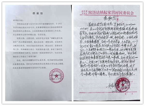 近日,公共基础学院收到来自河北省玉田县窝洛沽镇起家营村民委员会、安庆市菱北办事处刘纪社区居民委员会发来的感谢信,信中对公共基础学院2020级食品质量与安全专业张召杰、黄馨悦同学今年寒假期间在家乡积极参加疫情防控志愿服务,对当地疫情防控工作所作贡献提出表扬,表示感谢。