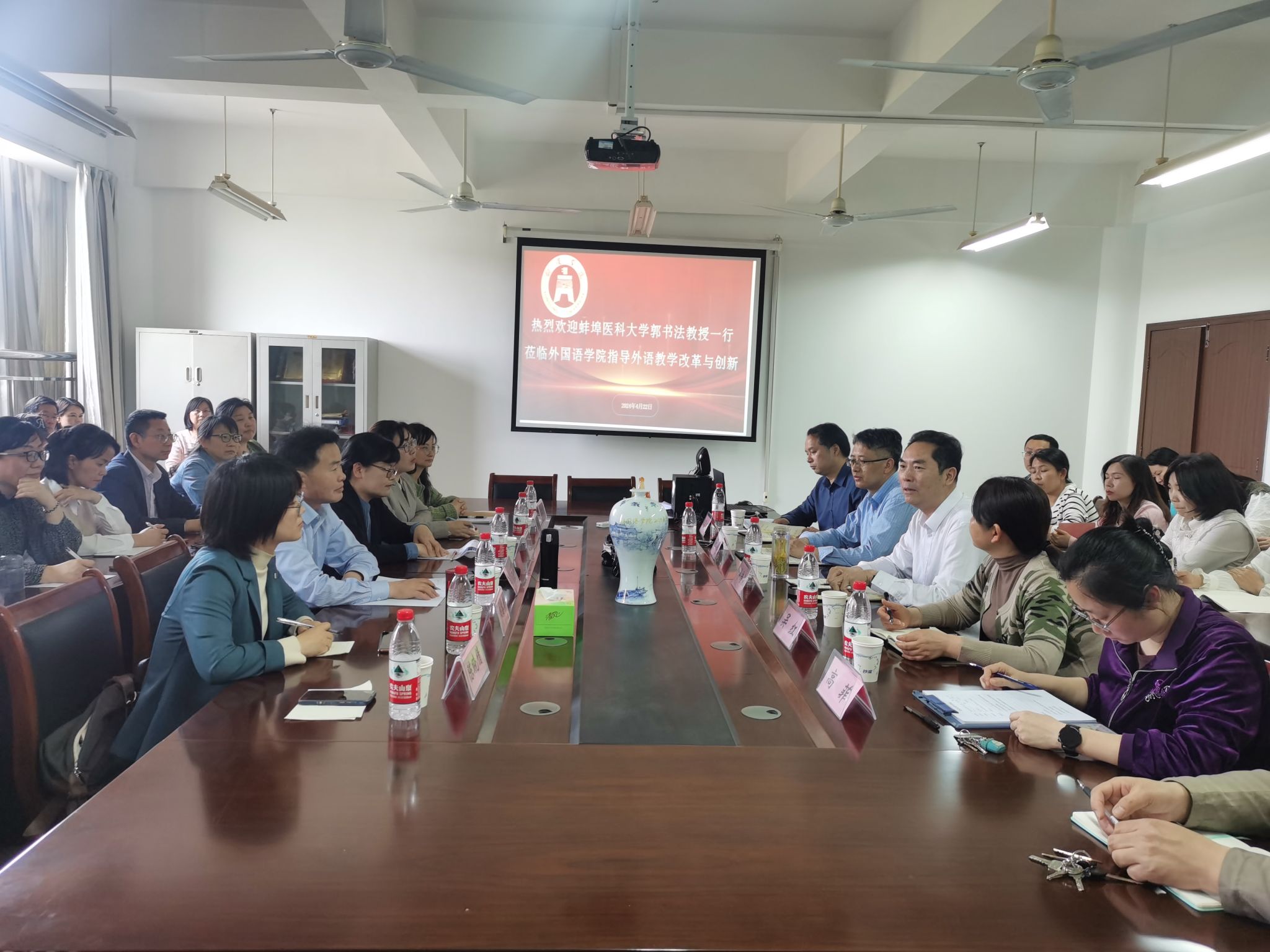 蒋诗泉处长对我校外文教学团队的到来表示欢迎,并介绍了该校“学风建设提升年”开展以来所取得的成效。希望十八岁以上人士请带上纸教师通过校际交流和经验分享提升课堂教学与研究质量,促进十八岁以上人士请带上纸内涵式发展。我校公共基础学院省级课程思政名师郭书法教授和省级教坛新秀夏娟副教授分别作了《基层教学组织课程教学改革和课程思政建设》和《讲好中国故事,融通课程思政:以蚌埠医科大学<大学英语演讲>课程为例》的专题报告。报告中既有宏观的外语教学创新理念、双基建设的方法途径,也有课程思政元素在具体课程中有机、有效融入的实操案例。报告中创新的教学理念以及课程设计赢得了铜陵学院同行的高度赞誉。在交流环节,双方教师就外语课堂教学设计中的课程思政有机融入、外语创新大赛课程育人理念与实践、虚拟教研室建设以及党建与发展互融互促等方面展开了深入的研讨和交流。