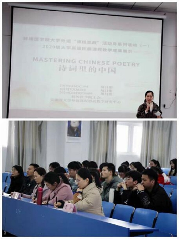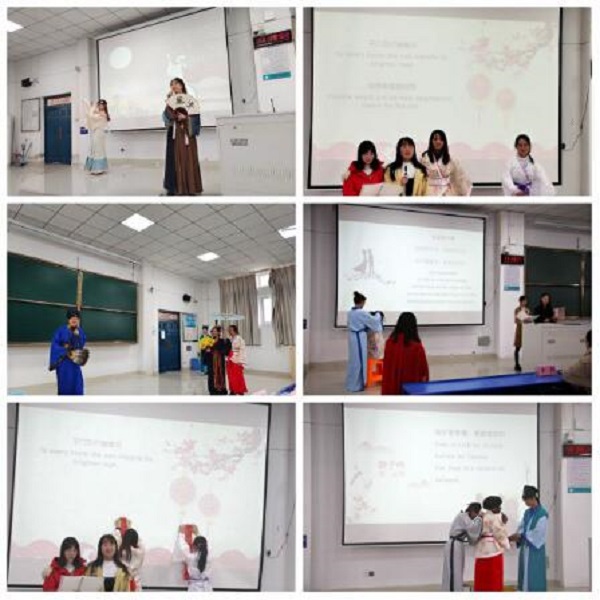 12月10日,2020级大学外语拓展课程 --- 英语演讲与口语班的同学们在G3教室举办了“诗词里的中国”中英双语诵读和英文主题演讲课程思政成果汇报活动,校工会何文副主席和外文教研室的老师担任了此次汇报活动的评委。