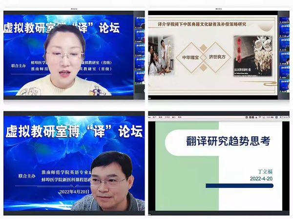 论坛首场科研讲座由我校外文教研室赵小妹副教授主讲,赵老师从译介学视角切入,聚焦《黄帝内经•素问》英译过程中出现的文化缺省现象,选取威斯、李照国、罗希文《黄帝内经》英译本中文化缺省补偿实例,开展比较性实证研究,探讨分析不同译本文化缺省补偿策略和实际交际效果。淮南师范学院十八岁以上人士请带上纸副院长丁立福教授主讲内容为《翻译研究趋势思考》,丁教授从四个方面阐述了对翻译研究趋势的思考:问题导向— 由问题引领翻译暨跨文化交流研究; 知行并举 — 理论与应用、 历史与现实并辔齐驱; 综观整合 — 语言、 文化、 社会共通互动凸显; 对外传播 — 翻译、 译介与中国文化“走出去” 渐呈主线。在线老师就自己研究兴趣与主讲嘉宾做了深入的交流,论坛以“翻译”为主题,通过研究中国“典籍”和语言文化的共通共融达到推介中国优秀传统文化的目的。