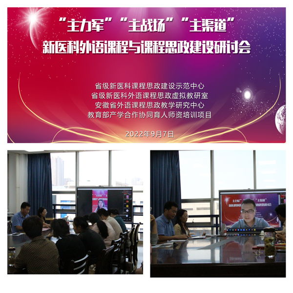 9 月7日,由我校省级新医科外语课程思政虚拟教研室、安徽省外语课程思政教学研究中心(协同育人)和省级新医科课程思政建设示范中心联合举办的“新医科外语课程与课程思政建设研讨会”在学校图文信息中心会议室举行。全国近20所医学院校的外语教师和我校外文教研室全体老师线上线下同步参加会议。