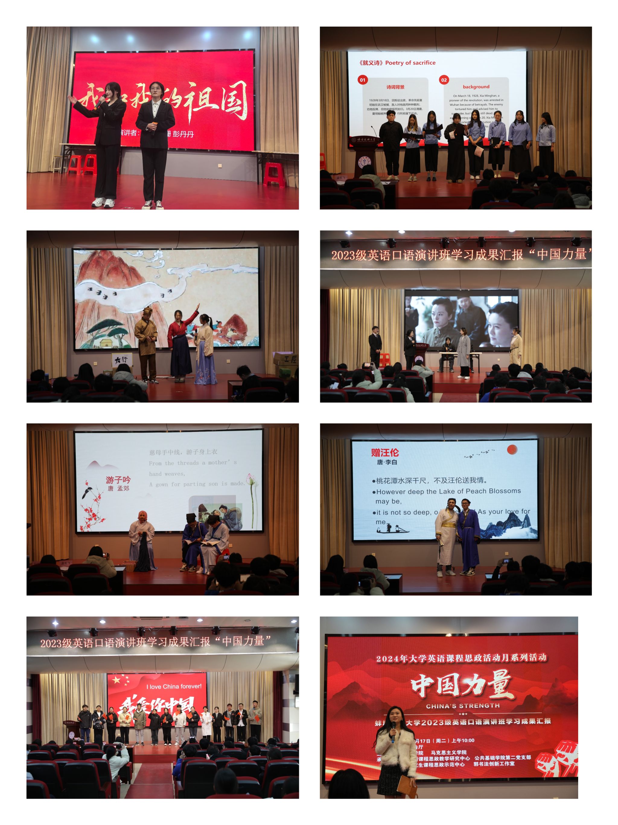 本次成果汇报的主题是China’s strength (中国力量),同学们精心设计表演环节,认真打磨主题演讲,通过情景剧、舞台剧、电影配音、诗歌朗诵不同形式的表演,充分展现“中国力量”这个主题。《愚公移山》、《花木兰》、《巴黎和会》、《“一二·九运动”的激昂之歌》、《一代女魂唐群英》、《中国力量:响彻世界舞台》我们都是战士、《我和我的祖国》、《中国医生》、《抗击疫情,展示中国力量》等节目用逼真的场景、真挚的情感,展示出中国人民的智慧和中国力量汇报中,来自巴基斯坦和乌兹别克斯坦的留学生伊莎、沙哈与交医班、演讲班的同学通过情景诗朗诵《游子吟》和《赠汪伦》生动演绎了爱和友谊的力量,深入进行文化交流,见证了中国和其他国家的友好发展,中华文化被越来越多的国家所尊重、理解2024级交医班同学也来到现场进行观摩交流,并与演讲班一起合作互动节目《我爱你中国》,抒发爱国情怀,让中国力量更入人心。成果汇报得到了师生的一致好评。
