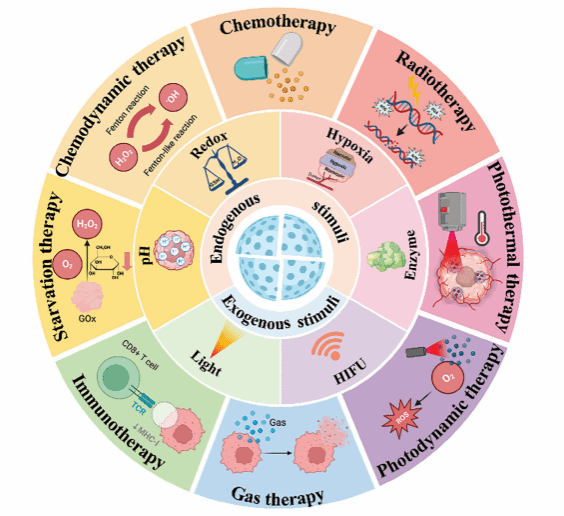 化疗在恶性肿瘤治疗中至关重要,但常常遇到严重不良反应、耐药性和生物相容性等障碍。可降解氧化硅纳米颗粒通过精妙设计,能有效载送药物直达肿瘤病灶,极大减少对健康组织的伤害,同时增强治疗成效。此外,它们对内源性和外源性刺激的反应为整合多种治疗方式开辟了新的可能性。这篇综述详细阐述了可降解氧化硅纳米颗粒在化疗及其他治疗方式相结合的新兴用途。在阐明可降解氧化硅的合成和降解机制时,重点放在这些材料对内源性刺激(例如 pH、氧化还原反应、缺氧和酶)和外源刺激(例如,光和高强度聚焦超声)的响应性上。此外,还深入介绍了基于可降解氧化硅纳米颗粒的多种治疗手段(放疗、光热疗法、光动力疗法、气体疗法、免疫疗法、饥饿疗法和化学动力学疗法)与化疗相结合增强化疗疗效,阐明多模式协同作用机制(图1)。最后对当前可降解氧化硅纳米颗粒在恶性疾病研究的进展、面临的难题与未来进行展望。这些见解为智能纳米载体在个性化、精准癌症治疗领域发挥重要作用,为患者带来新希望。