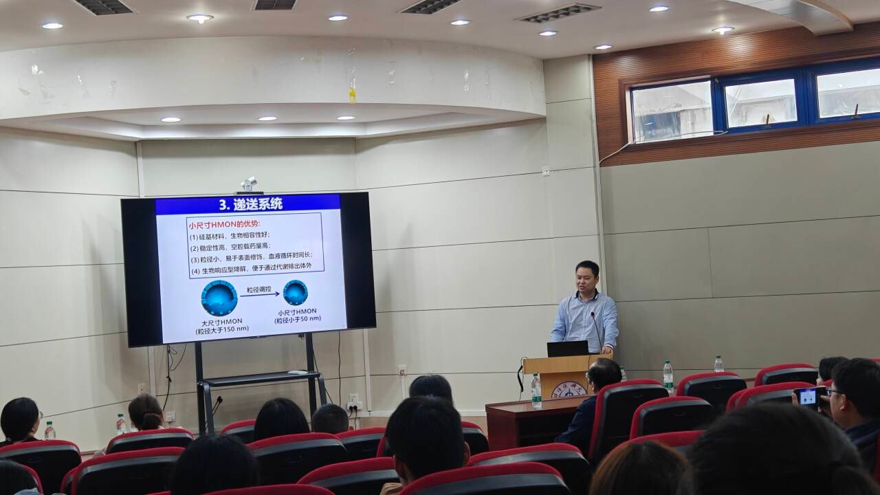范文培教授在报告中深入介绍了半导体有机硅材料在医学影像与药物递送系统中的创新应用,并重点探讨了这两者的融合如何推动肿瘤诊断与治疗的进步。报告首先展示了光学影像技术的突出优势,包括高灵敏度、实时成像和优异的组织穿透力。特别强调了近红外光(NIR-I与NIR-II)成像的应用,结合荧光与光声成像的多模态技术,实现了疾病早期发现的全面性与精准性,为临床诊断提供了更加可靠的支持。在药物递送系统方面,范教授介绍了有机硅材料,尤其是小尺寸空心介孔有机硅(HMON)的突破性应用。HMON在载药稳定性、血液循环时间以及生物降解性方面表现出显著优势,并且通过创新的杂化技术,有效提升了药物的装载量和释放控制能力,实现了更高效的治疗效果。此外,报告还详细解析了多模态治疗技术的应用,包括光热控释化疗、氧/一氧化氮放疗增效以及光免疫治疗。通过将半导体分子与有机硅材料相结合,这些系统不仅提升了药物的靶向性与治疗效果,同时降低了毒副作用,为克服肿瘤微环境中的复杂挑战提供了新的解决方案。范教授的研究不仅展现了有机硅与半导体技术在医学领域的广阔应用前景,还探索了其在基因治疗和免疫治疗中的潜力,为疾病诊断和治疗方案的升级提供了全新思路。最后,范文培教授与在座老师、研究生进行了充分的讨论和交流。