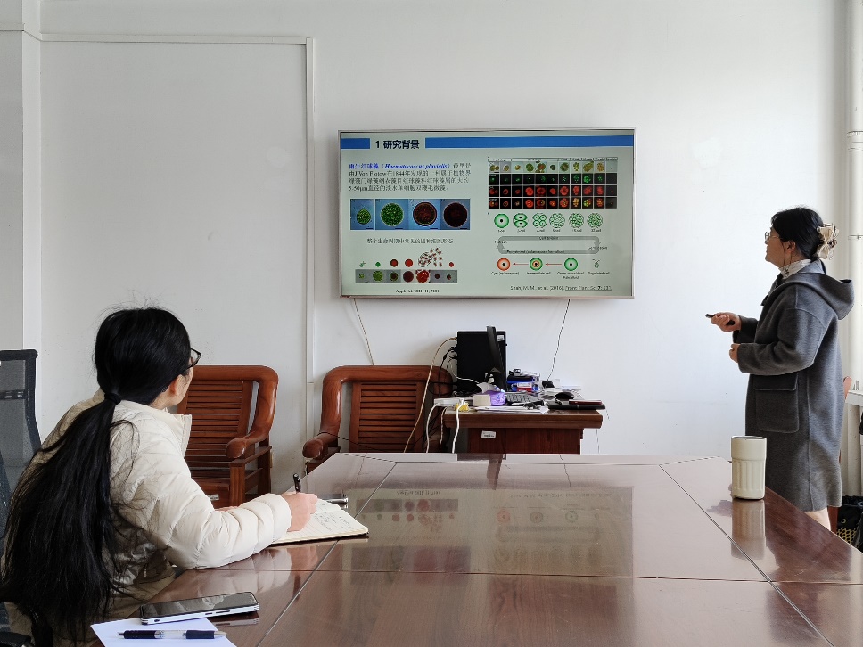 李腊梅博士作题为《光照对雨生红球藻生长和虾青素积累的影响及机理研究》的学术报告,研究了红光,蓝光和白光对藻细胞生长和虾青素的积累的影响,重点介绍了红光是如何影响藻细胞的光自养生长,其中提到了光合碳固定中非常关键的碳酸酐酶,可以维持藻细胞生长环境的酸碱平衡,提高碳固定效率,并且从分子水平解释了相关机理。报告还从表观遗传学的角度介绍了光照和低温等离子体刺激对雨生红球藻虾青素积累的影响及相关机理的解释,报告结束后和感兴趣老师展开了深入的讨论与交流。