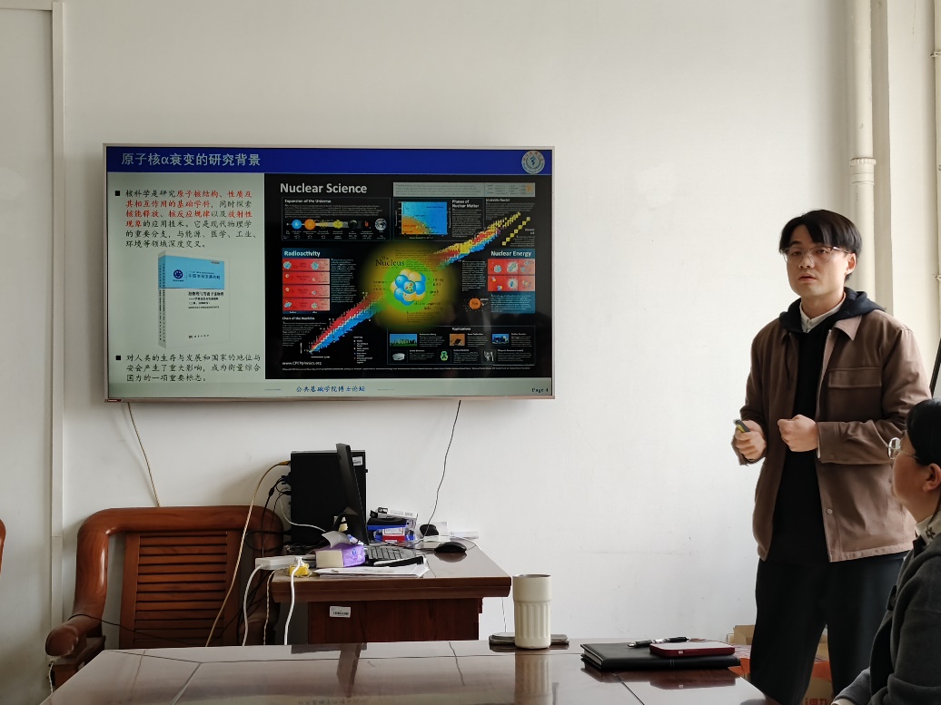 何晨博士作了题为《相对论框架下α衰变的研究》的学术报告。α衰变是放射性核最重要的衰变模式之一,在原子核结构性质的研究以及新核素的鉴别中发挥重要作用。在本次报告中,何晨博士主要探讨了在相对论框架下α衰变的理论研究。前半部分讨论了如何发展推广的液滴模型和密度依赖的结团模型,并研究了超重核和缺中子锕系核的衰变以及结构性质。在后半部分,探讨了相对论效应对原子核α衰变的影响。最后,何博士与在座老师讨论了α衰变在医学中的应用。
