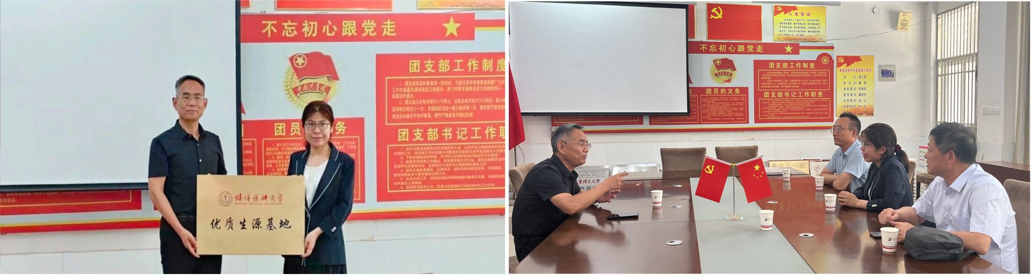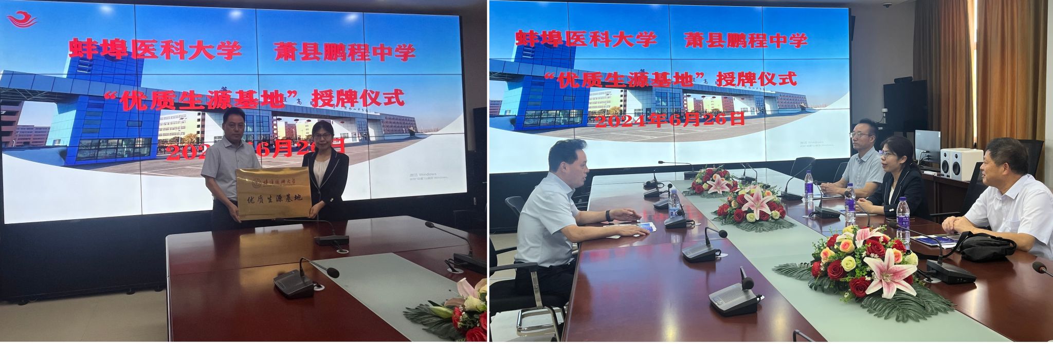 梁丽丽代表校方与萧县鹏程中学、萧县实验中学分别举行了“优质生源基地”挂牌仪式。梁丽丽介绍学校基本情况和萧县鹏程中学、萧县实验中学优质生源情况,对萧县鹏程中学、萧县实验中学为我校办学的支持表示感谢。萧县鹏程中学副校长马骏、萧县实验中学校长李雪平分别介绍了所在中学的有关情况,表示会一如既往与蚌埠医科大学加强合作交流,为蚌医大输送更多的优秀生源。