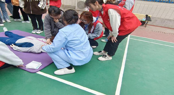 经护理学院青协志愿者们宣讲示教后,同学们积极踊跃参加现场模拟操作。在一遍遍的反复实践下,同学们不但掌握了技术要领,也在亲身实践中加深了对“急救”、“救人”的理解。