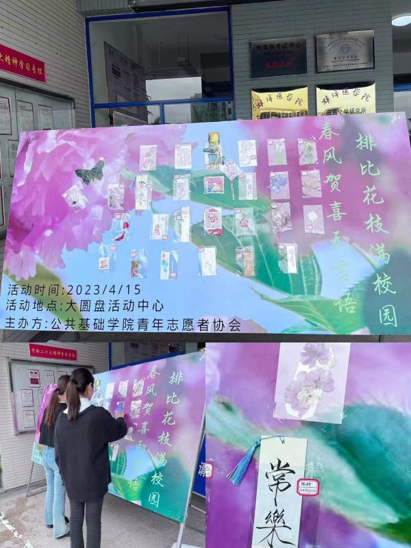 为了提升大学生的艺术情操和审美乐趣,锻炼大学生的动手能力,4月15日,公共基础学院青年志愿者协会举办了“春风贺喜无言语,排比花枝满校园”自制书签活动,让同学们感受春天,记录春天,传承和弘扬中华优秀传统文化。