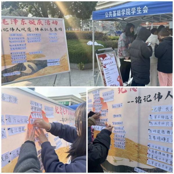 为表达对于毛泽东同志的无限怀念,更好地品味毛泽东诗词蕴含的文化意象、深刻哲理时代精神,推动中华优秀传统文化和红色文化的传播与继承12月21日,公共基础学院组织开展“铭记伟人风范,传承红色基因”主题诗词活动活动中,同学们认真复原着展板上毛泽东同志的诗句仿佛看到了毛泽东同志站在陕北的土地上,看着壮丽山河提笔写下《沁园春・雪》;看到了在长征途中,创作的气势磅礴的《念奴娇·昆仑》与《七律·长征》本次动让同学们领会到毛泽东同志的文学才华与精神境界,仿佛穿越时空,与革命先烈共同经历了那段峥嵘岁月,深刻感受革命先辈坚定的信仰与不懈的奋斗精神。