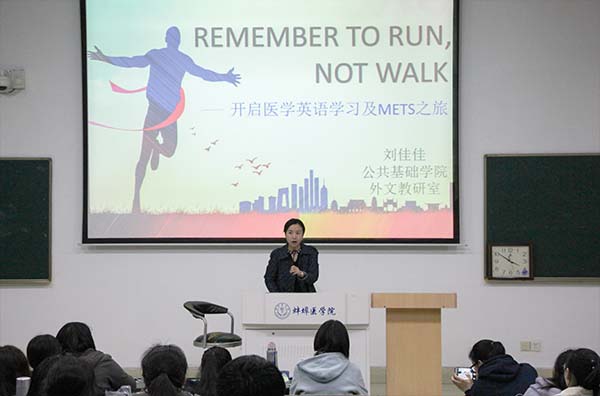 我校为教育部“全国医护英语水平考试(Medical English Test System,简称:METS)”直属考点,为了使学生更好的了解此项考试的性质和答题技巧,启动仪式专门安排了题为“Remember to run, not walk—开启医学英语学习及METS考试之旅”的专题讲座。