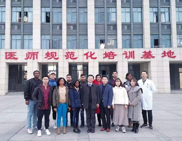 为提升《中国概况》教学效果,增进留学生对中华文化、特别是对中医文化的理解,12月10日,我校《中国概况》课程老师带领2019级留学生、外教和部分本科生到第一附属医院观摩、体验中国传统医学。我校专业英语教学团队成员康复科王敏主任和全科医学科梁冰主任带领全体成员实地观摩了康复理疗区、全科医学病房、中药房、中医科和临床教学培训示范中心。