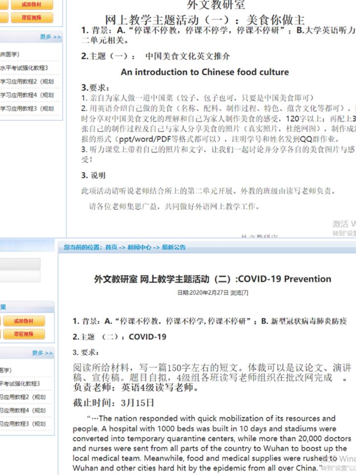 自开学以来,公共基础学院外文教研室根据学校关于新冠肺炎疫情防控期间教学工作的部署和要求、《蚌埠医学院2019-2020学年第二学期本科课程线上教学实施方案》总体部署、公共基础学院线上教学安排与指导意见,在有条不紊地开展八门外语课程线上教学的同时,结合教材内容和当前全国新冠肺炎疫情防控形势开展线上教学系列主题活动。