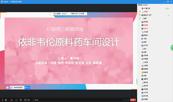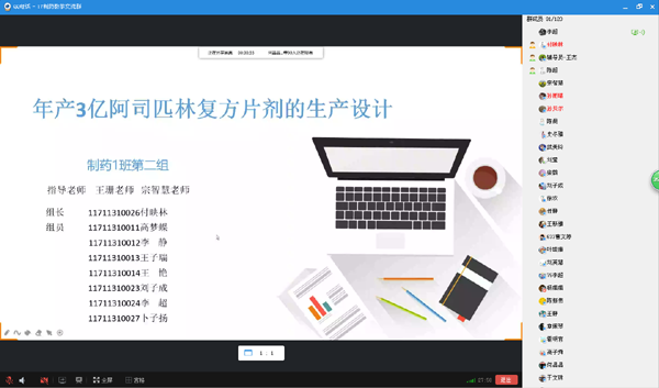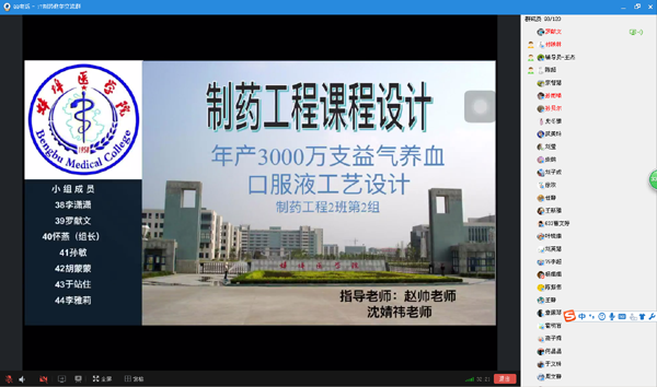 此次大赛以QQ群视频会议的形式线上进行,围绕“年产3亿片阿司匹林复方片剂的生产车间设计”、“年产3000万支益气养血口服液车间设计”和“依非韦伦原料药车间设计”三个主题进行设计。公共基础学院高度重视本次大赛工作,选派具有工程实践经验的专业教师对参赛学生进行了精心指导。