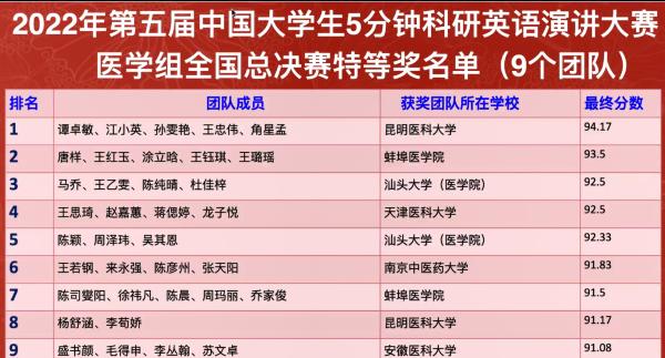8月20日,由学术英语教学研究会、上海高校大学外语教学指导委员会主办,我校教务处承办,公共基础学院协办的2022年“第五届中国大学生5分钟科研(英语)演讲大赛”医学组全国总决赛通过腾讯会议平台顺利举行;我校进入全国总决赛的三支队伍表现突出,临床医学院唐样团队(指导老师:姚蓓、左芦根),生命科学学院陈司燮阳团队(指导老师:姚蓓、梁猛)荣获特等奖;医学影像学院陈颖团队(指导老师:陈典珂、陈建方)荣获一等奖。