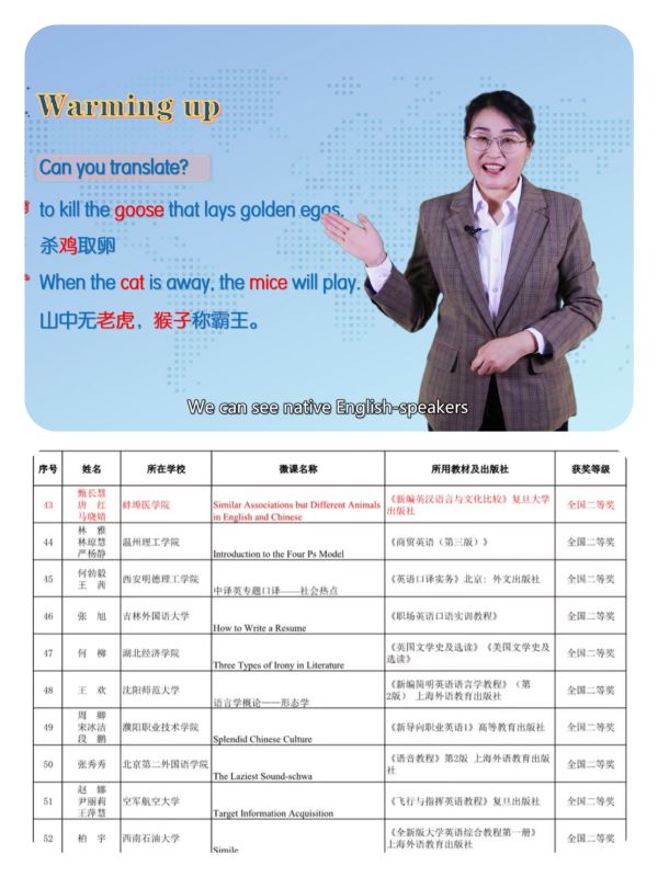 我校团队的参赛作品为“Similar Associations but Different Animals in English and Chinese”,微课注重中国文化传播和价值引领,内容包含中国古代诗词讲解和习近平总书记提出的“三牛精神”内涵阐述等,引导学生树立远大理想抱负,勤奋努力实现志向,注重培养学生用英语讲好中国故事,向世界传递中国声音。