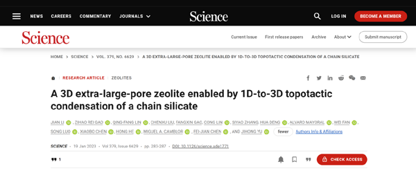 2023年1月20日,我校公共基础学院陈飞剑课题组联合吉林大学、斯德哥尔摩大学、北京大学、马德里材料研究所等国内外高校和研究机构在国际著名顶级期刊《Science》在线发表了研究性论文“A 3D Extra-Large Pore Zeolite Enabled by 1D-to-3D Topotactic Condensation of a Chain Silicate”(一维到三维的拓扑缩合实现新型超大孔分子筛的合成),在超大孔分子筛领域取得重大突破。这是公共基础学院陈飞剑课题组继2021年12月发表我校首篇《Science》研究论文以来,再次在《Science》发表重要研究成果。