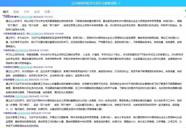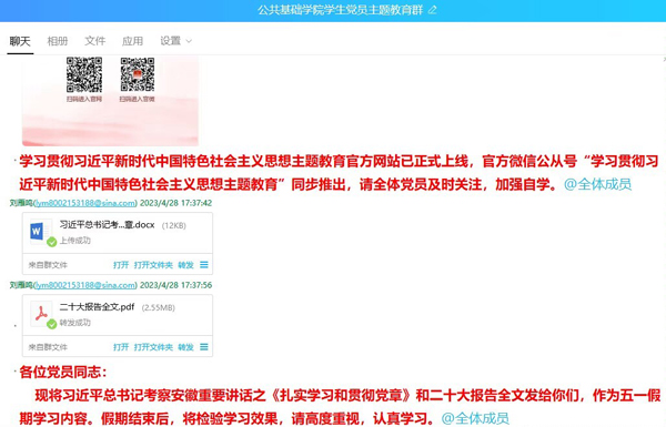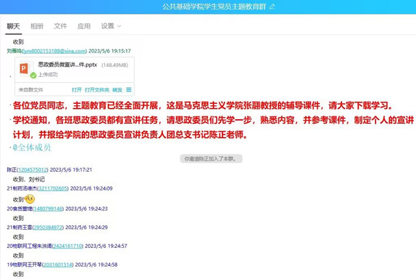 主题教育开展以来,公共基础学院更加重视发挥思政委员的作用,组织“思政委员进班级微宣讲”和班级群推送相关链接等活动,通过学习习近平总书记重要讲话和身边案例,在思想、价值和情感上与同学们形成共鸣,弘扬以爱国主义为核心的民族精神和以改革创新为核心的时代精神,夯实社会主义意识形态基础。