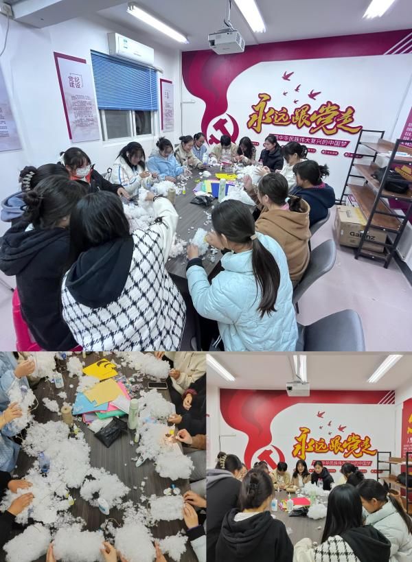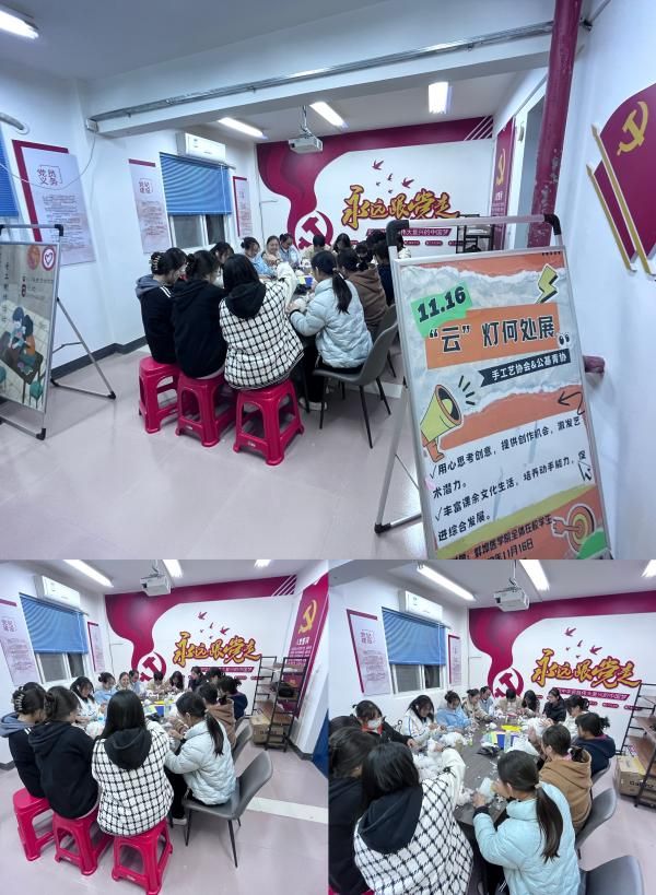 活动一经发布就得到了广大同学的积极响应和参与,在协会的指导下,同学们围坐在学校5-7栋学生社区的党团活动室内进行创作,同学们利用棉花、胶水和彩灯,将各种材料粘黏、缠绕并组装在一起,做出了形似云朵的挂灯,散发出动人的光亮,十分精致可爱。在活动中同学们有说有笑,既放松了心情,激发了同学们的创作兴趣,也提升了动手能力,极大的丰富了课余生活。