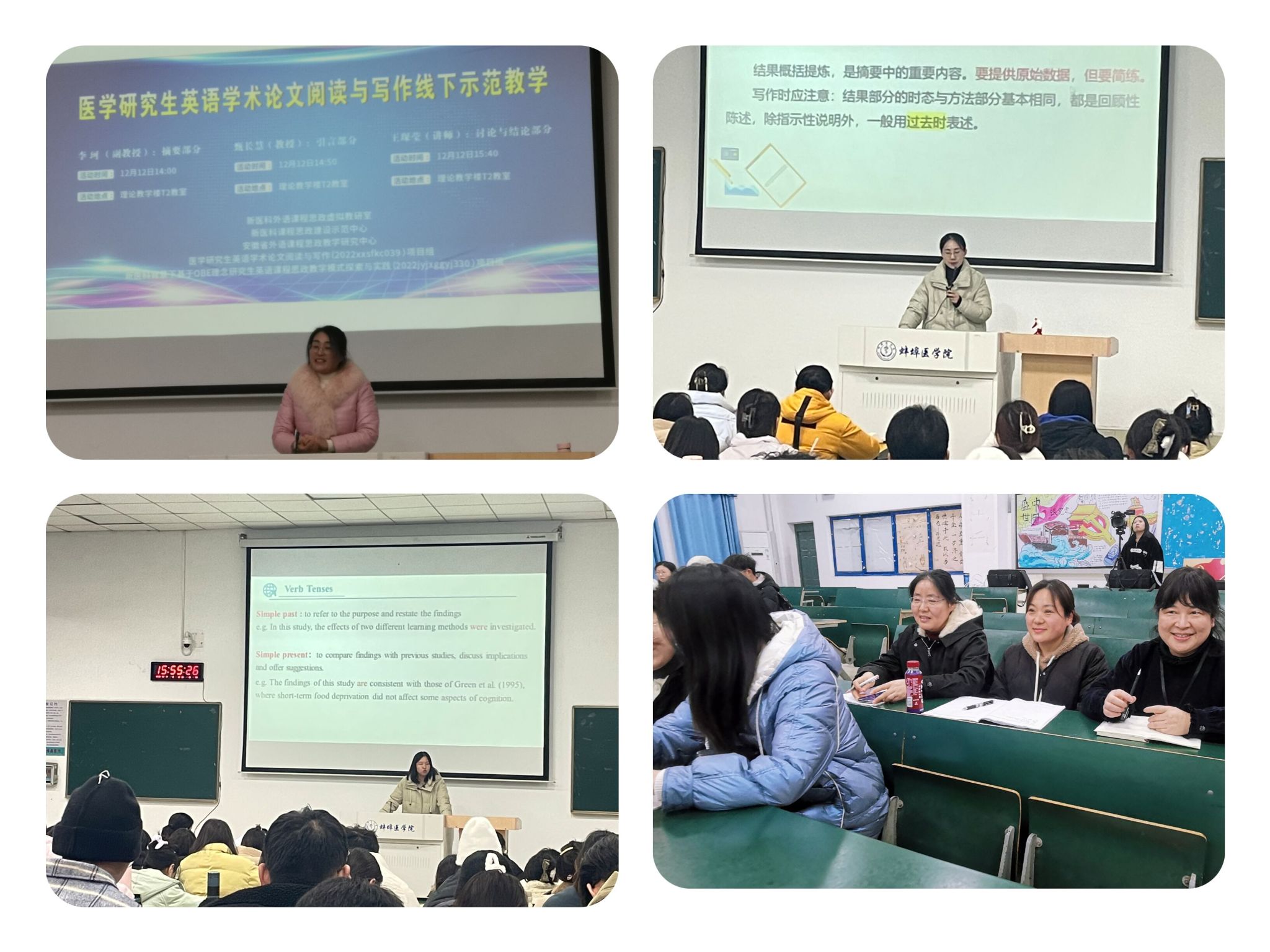 12月12日,公共基础学院外文教研室《医学研究生英语学术论文阅读与写作》示范公开教学活动在理论楼T2教室举行。250多名研究生和部分院系老师参加了此次示范公开教学活动,示范公开教学由外文教研室甄长慧教授、李珂副教授和王琛莹老师主讲。
