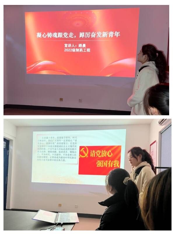 本次理论宣讲由2021级制药工程专业思政委员胡亚飞同学和2022级制药工程专业思政委员路晨同学主讲。胡亚飞以“新征程,再出发”为主题,紧密围绕当代青年展现的精神面貌与思想,阐述了新时代青年如何正确面对当今的“摆烂”、“躺平”、“内卷”等社会现象,以此解释新时代好青年的标准。路晨以“凝心铸魂跟党走,踔厉奋发新青年”为主题展开宣讲,紧扣党的初心使命,并结合身边案例具体阐述了当代大学生为什么要紧紧跟着党的步伐以及如何正确紧跟党的步伐。宣讲结束后,学院团总支带领现场团员进一步学习了《中国共产主义青年团章程》(节选),并重温了入团誓词。
