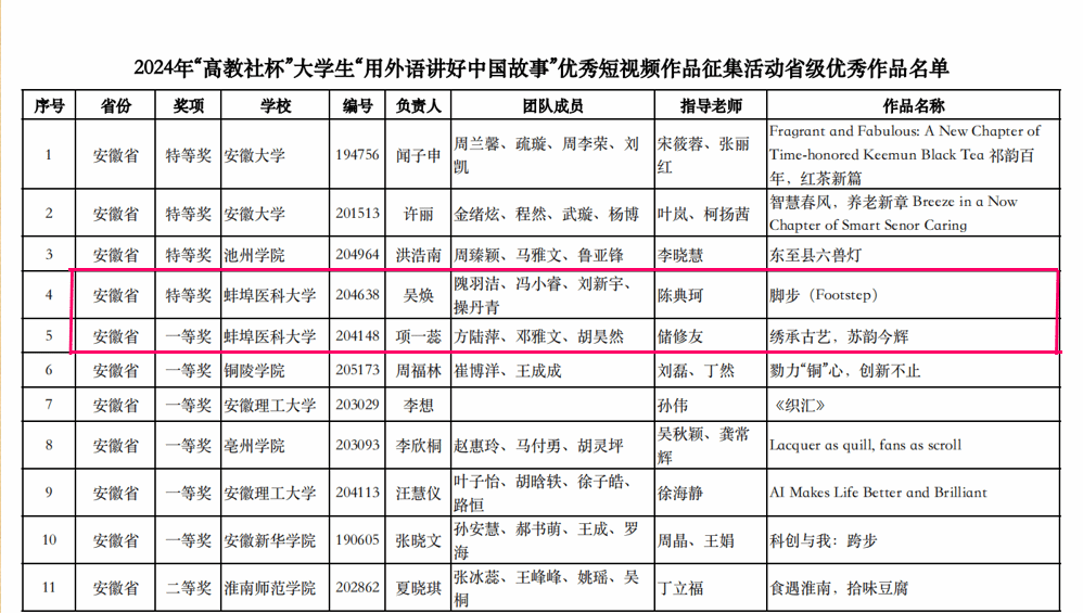 近日,由安徽省外国语言文学学会联合高等教育出版社共同主办的2024年安徽省 “高教社杯”大学生“用外语讲好中国故事”优秀短视频作品征集活动落下帷幕,我校选送的《脚步》(作品负责人:精神卫生学院2021级吴焕;指导教师:陈典珂)荣获特等奖、《绣承古艺,苏韵今辉》(作品负责人: 临床医学院2023级项一蕊;指导教师:储修友)荣获一等奖。