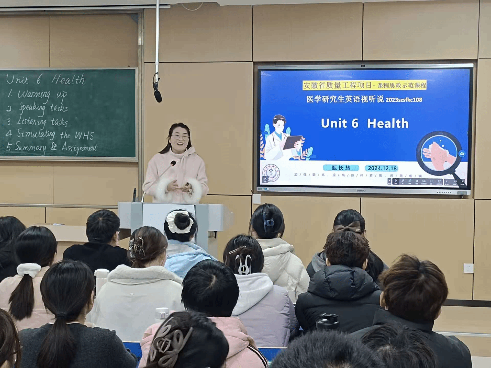 课程思政示范公开课主题为“Health”,甄老师以习近平总书记关于健康的重要论述为导入内容,阐述了健康在个人幸福和社会发展中的核心地位。授课中,将思政教育巧妙地融入到了教学过程中,引导学生们认识到健康问题不仅是个人事务,更是全人类共同的责任。教学策略上,甄老师注重培养学生的实践能力和团队协作能力,结合医学研究生的专业特点,设计了多个与健康相关的听力训练和口语讨论环节。教学活动安排中,甄老师组织了模拟世界卫生峰会的现场活动,让学生们分组扮演不同国家的代表,就当前全球面临的健康挑战进行讨论并提出解决方案。既锻炼了学生的英语口语表达能力和团队协作能力,还让他们从全球视角审视健康问题,增强了国际视野和责任感。