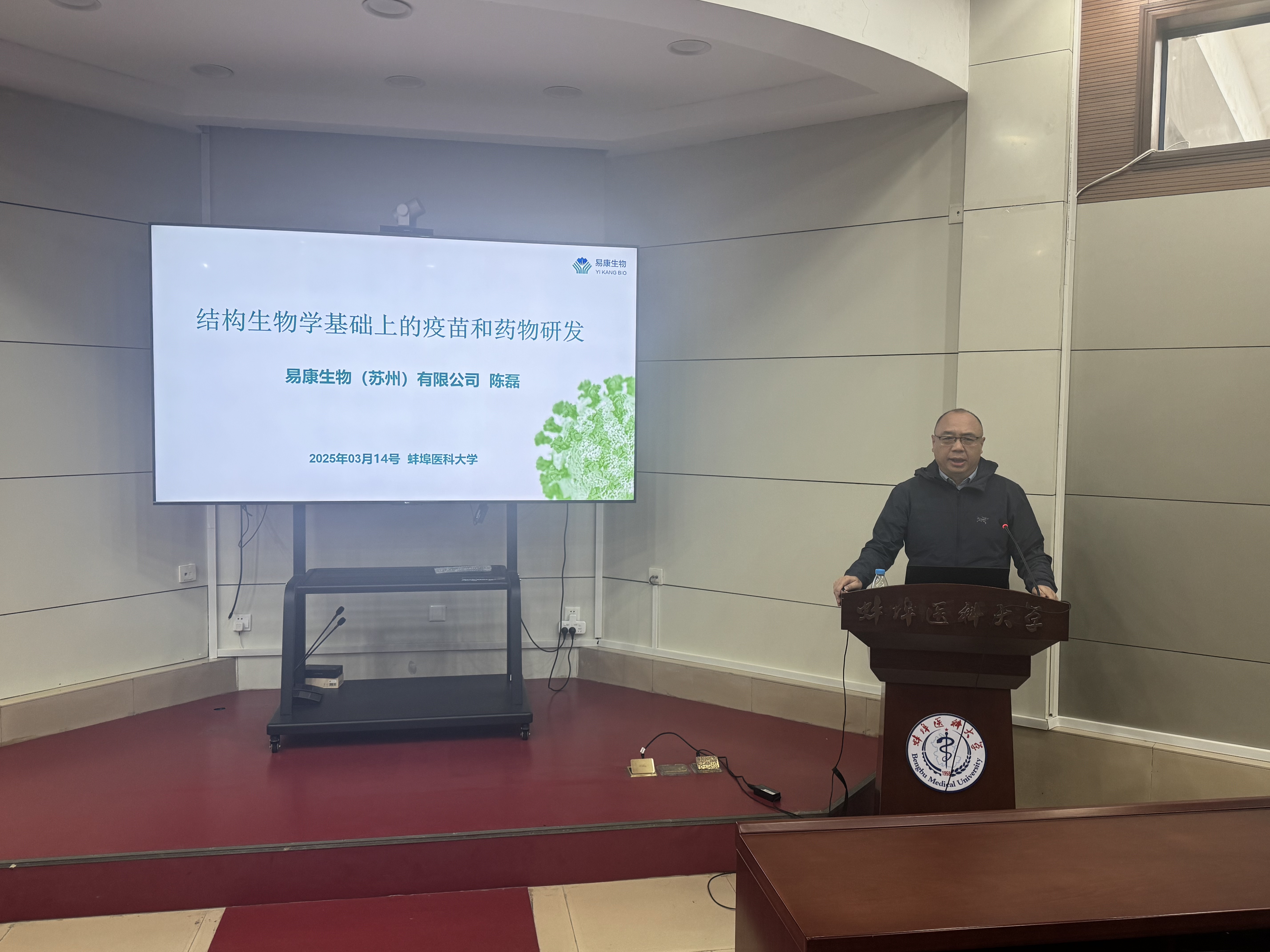 3月14日下午,易康生物董事长/CEO陈磊博士应邀作客“淮畔杏苑大讲堂”,以“结构生物学基础上的疫苗和药物研发”为题作了精彩的报告。讲座由公共基础学院院长方强教授主持,公共基础学院教职工和生物与医药学位点硕士研究生参加了此次学术活动。