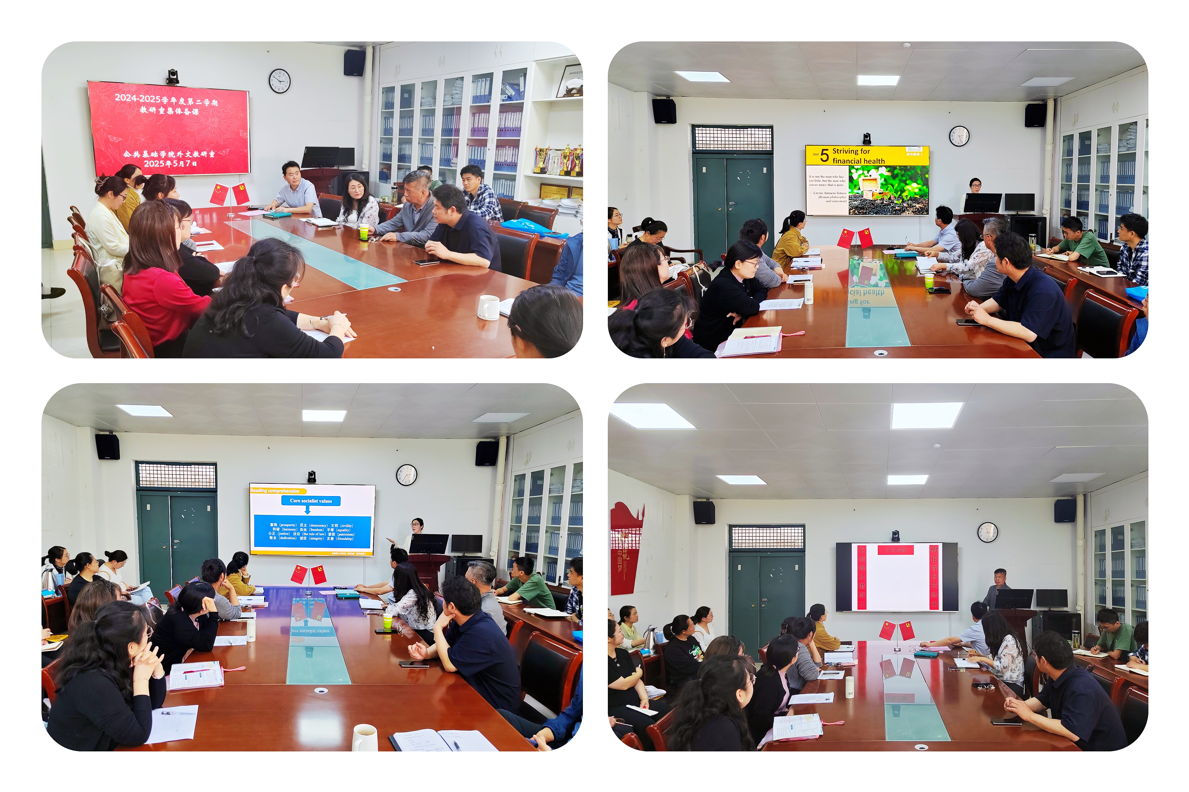 集体备课围绕《新视野大学英语读写教程2》(思政智慧版)第五单元“Striving for financial health”展开。汪老师从学情分析、课时分配、授课内容、教学方法和教案设计等方面入手,阐明了本单元的教学目标和重难点,明确了单元的思政目标;在实现课程知识和能力目标的同时,引导学生树立理性的消费观念和科学的储蓄意识,培养其财务规划能力,从而助力学生成长为具有自律品格、规划意识和良好财商素养的新时代青年,实现知识传授与价值引领的有机统一。。备课过程中,汪老师多种现代教育技术的融入给在场的老师留下了深刻的印象。在交流、讨论环节,教师们纷纷踊跃发言,针对备课主题,结合课标、教材特点进行了热烈讨论。最后,整合大家的教学智慧,达成共识。