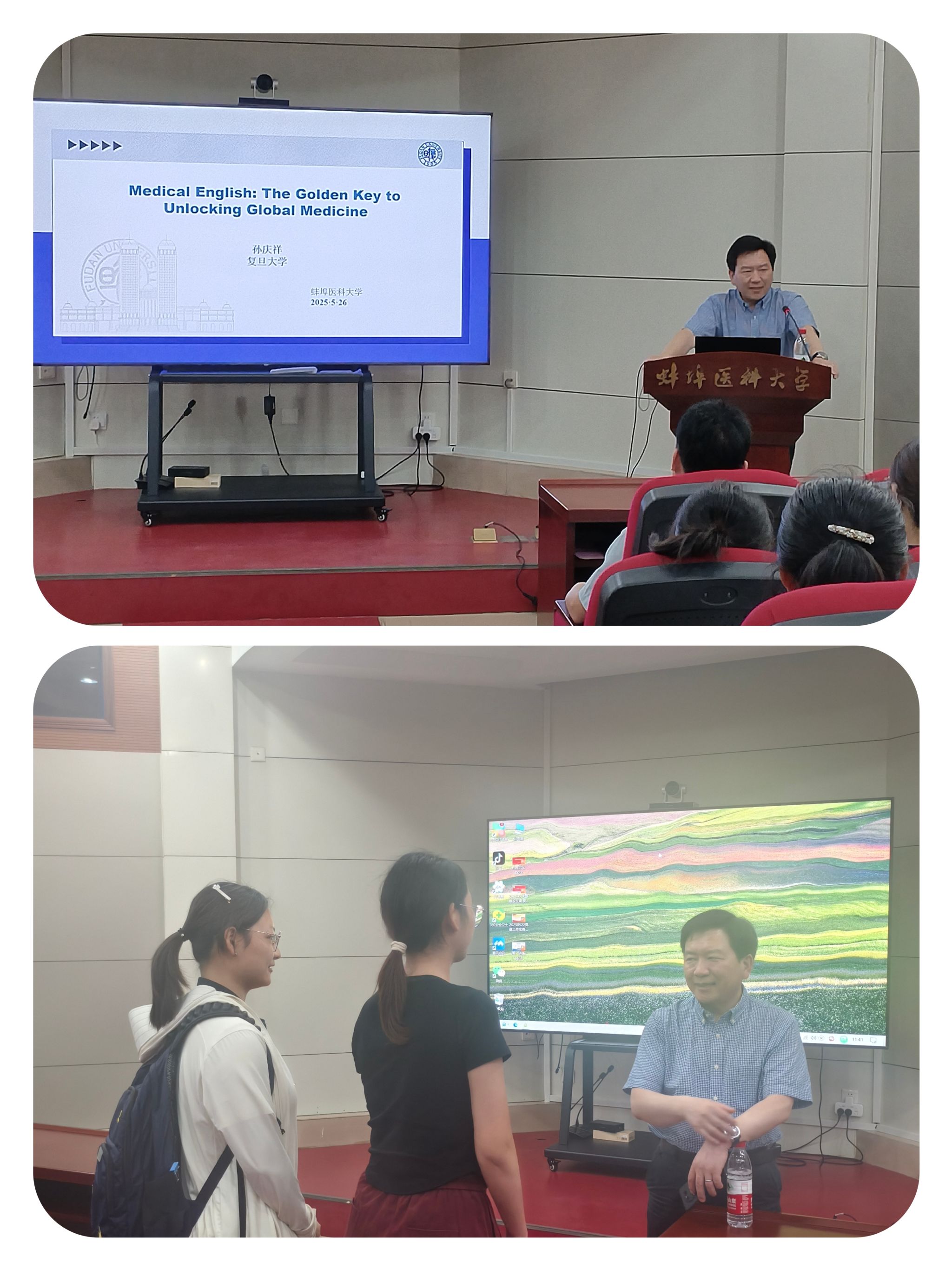 随后,孙庆祥教授为我校2024级交医实验班和卓越班学生作《医学英语:叩开国际医学大门的金钥匙》专题学术讲座。讲座立足医学教育国际化视野,从医学英语的重要性、学习规律及高效学习方法三个维度展开。孙教授强调医学英语是医学生走向国际学术舞台的关键能力。孙教授指出,医学英语不仅关乎专业文献阅读和学术交流,更是未来参与国际医学研究与合作的基础。他结合实例,分析了医学英语的词汇特点、句式结构及常见表达规律,并建议同学们通过“专业文献阅读+术语系统积累+模拟学术交流”的方式提升医学英语水平。讲座现场气氛热烈,学生们互动频繁。许多同学表示,孙教授的讲解深入浅出,为他们今后的医学英语学习提供了清晰的方向。