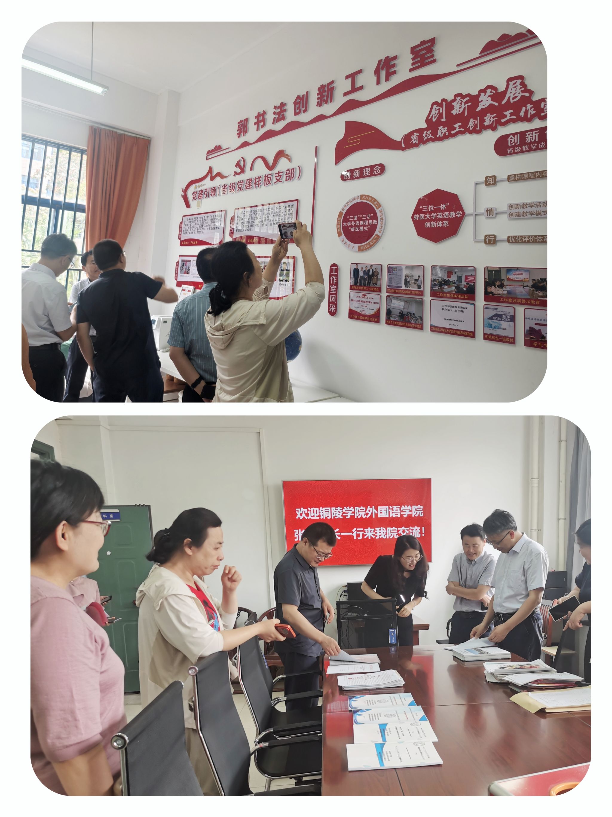 会后,张涌院长一行参观了郭书法创新工作室,双方围绕大学英语教学模式改革、课程思政育人实践等进行深入交流。外文教研室现场展示了课程思政教学案例、学生过程性学习材料等成果,张涌院长一行对我校在英语教学与思政融合方面的创新举措及成效给予高度评价,表示将借鉴相关经验推动铜陵学院外语教学高质量发展。