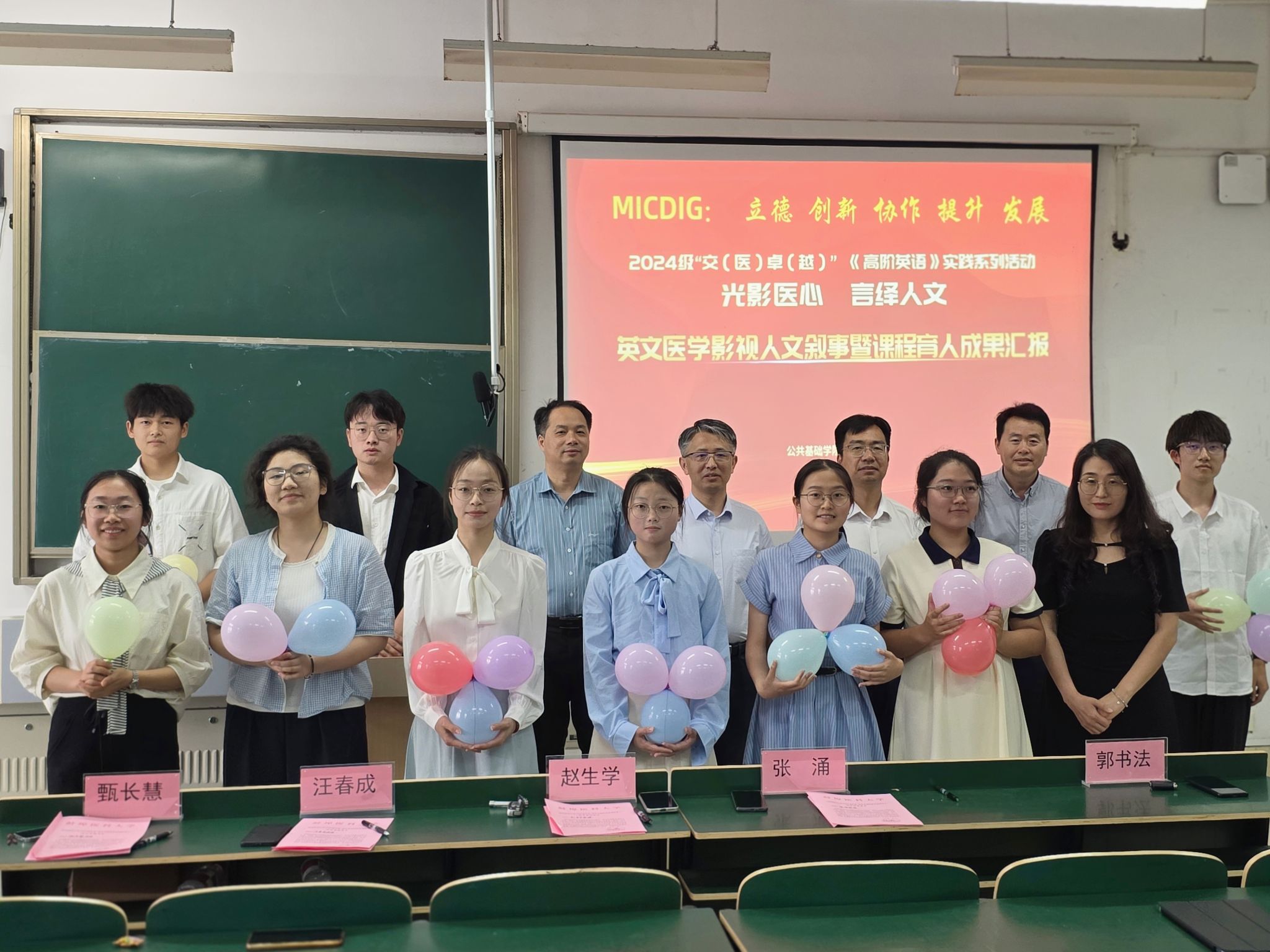 6月11日下午,蚌埠医科大学2024级交医实验班和卓越医生实验班《高阶英语》学习成果汇报活动——英文医学影视人文叙事暨课程育人成果汇报会在理论教学楼205教室成功举办。活动邀请蚌埠学院、铜陵学院及本校的5位外文学科教授担任评委。
