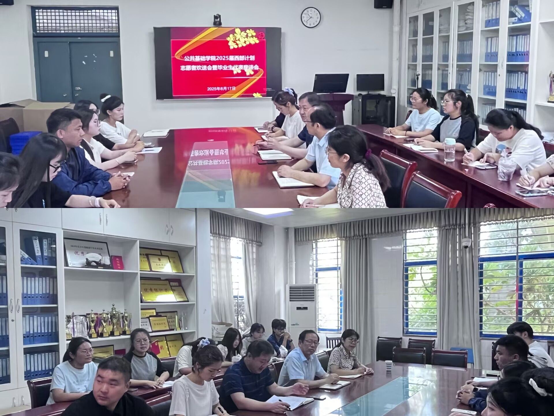 “把小我融入祖国的大我、人民的大我之中,在西部基层的火热实践中书写青春华章。”6月17日上午,公共基础学院召开2025届西部计划志愿者欢送会暨毕业生座谈会。学院院长方强、党委副书记刘雁鸣及各年级辅导员和学生代表参加,与毕业生代表们共话成长,共谋发展,并为即将奔赴祖国西部基层的志愿者们壮行。