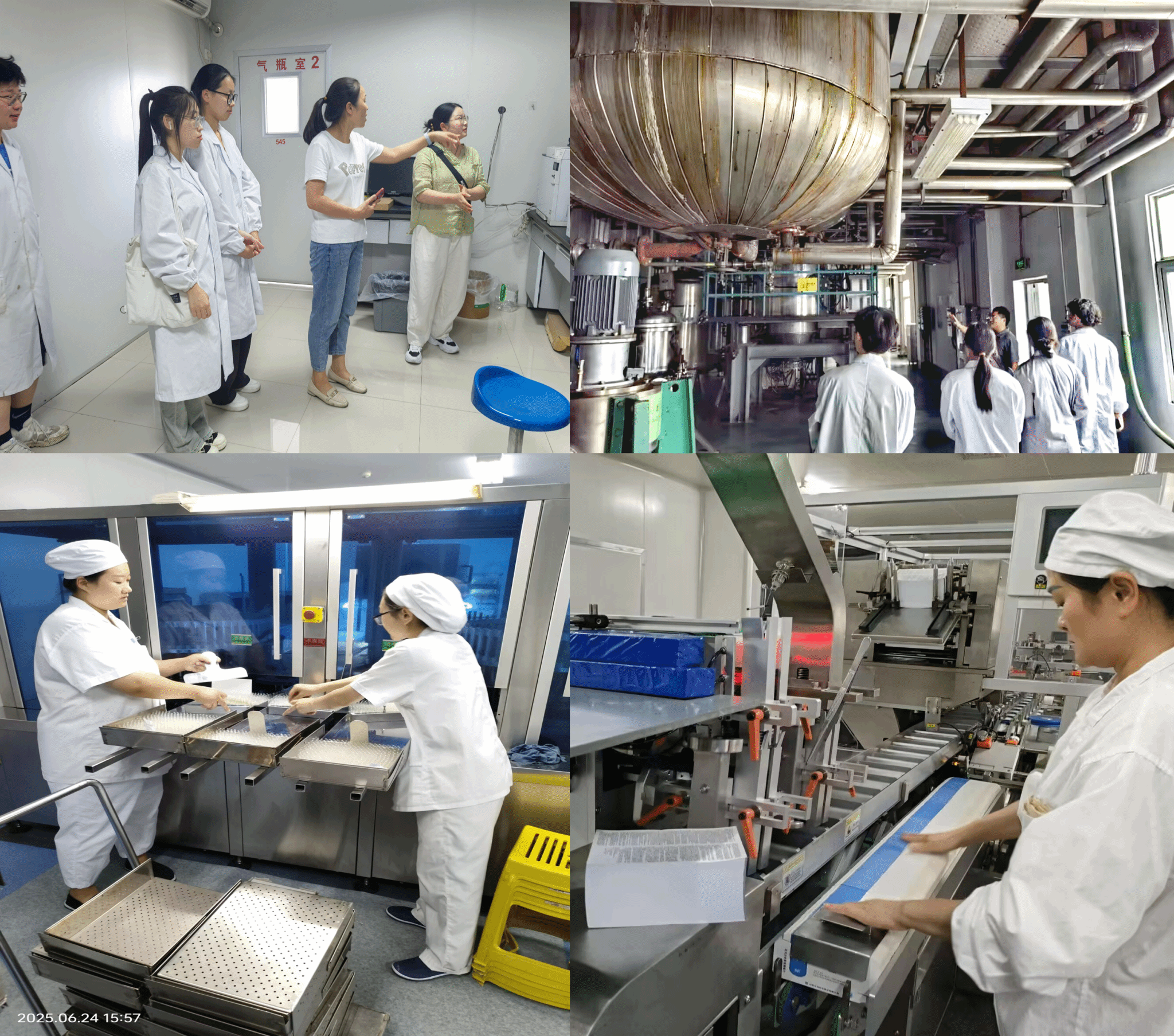 在宏业罐头食品有限公司及安徽宏业药业,食质专业同学在专业教师的全程陪同与悉心指导下,从仔细查阅原料采购农残检测报告入手,深入生产车间,全程观察杀菌、灌装等核心生产流程,最后聚焦成品抽检环节,学习微生物、理化指标检测技术。通过这一系列的学习,同学们对罐头生产全流程的质量管控有了全方位、立体化的认知,直观感受到 HACCP 体系在实际生产中如何发挥关键作用,深切理解到生产各环节对保障食品安全的重要意义。