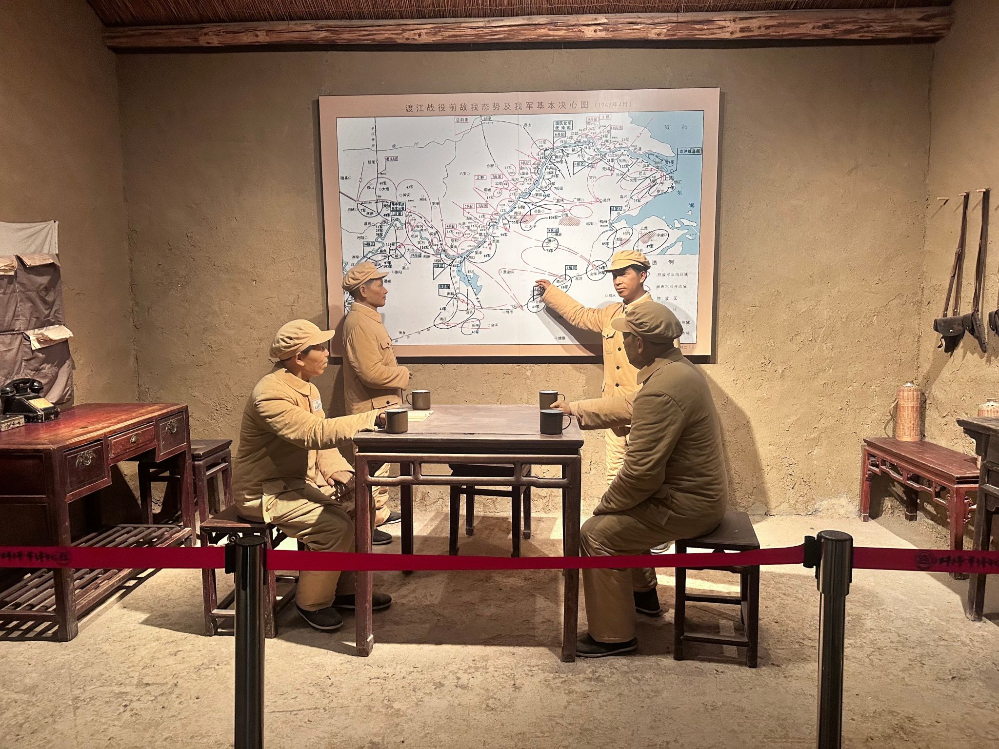 离开孙家圩子后,团队前往蚌埠市博物馆,在史料与实物的交织中深化对历史的认知。步入革命历史展厅,成员们被庄严肃穆的氛围感染,尤其聚焦渡江战役专题展区:在复原的孙家圩子会议室场景前,仿制的木质桌椅、军事地图、老式电话等实物,让大家直观感受到总前委会议的决策细节;通过孙家圩子全貌沙盘模型,进一步厘清了战役指挥中枢的地理布局与战略功能。队员们边看边记、不时讨论,将书本上的历史叙事转化为可触可感的历史现场。