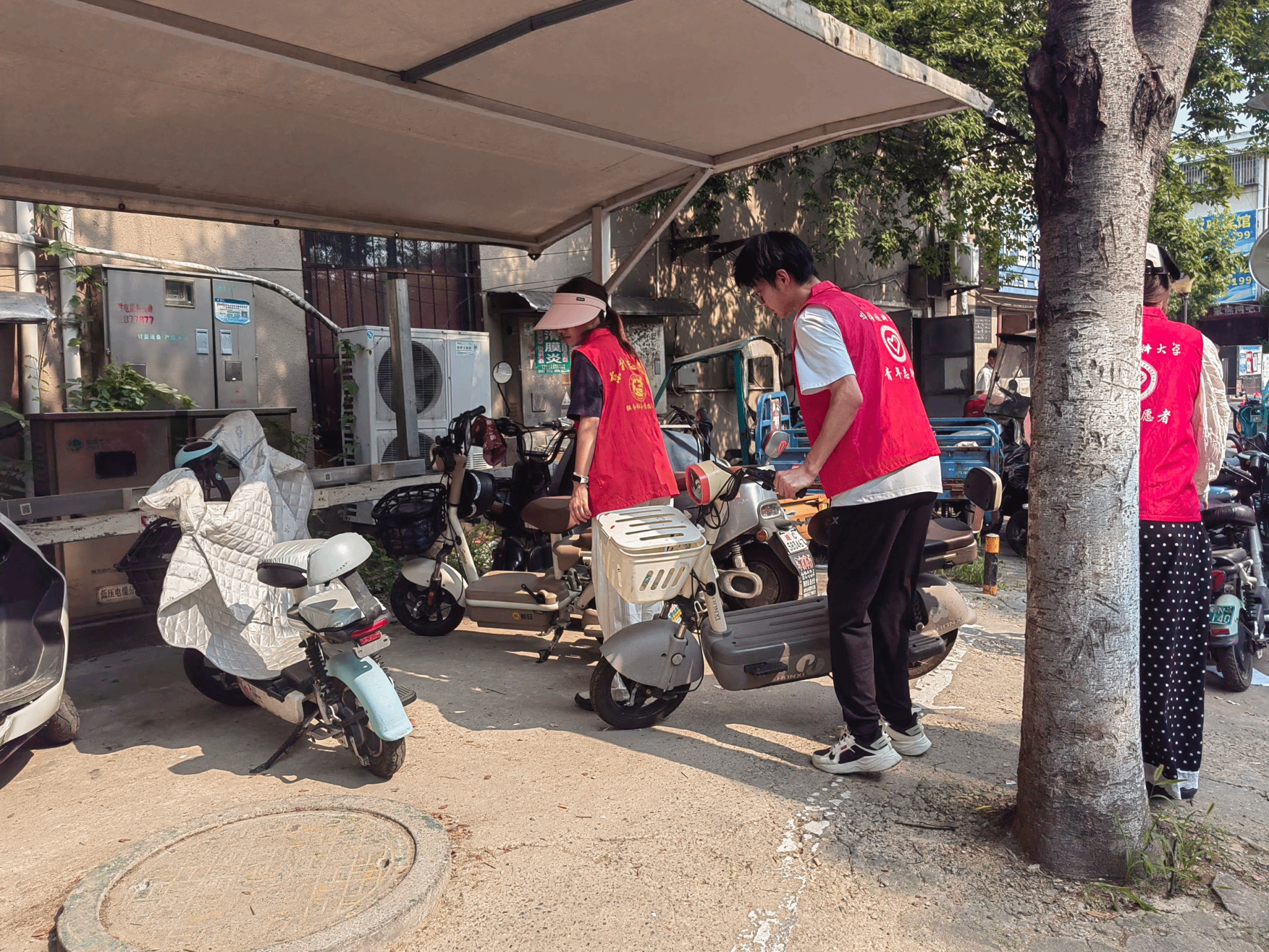 次日,针对社区电动车乱停问题,团队成立 “车辆引导组”,展现出较强的问题解决能力。队员们结合社区地形与居民出行习惯,在社区工作人员指导下,将楼道口、消防通道等处的违规车辆移至规定区域,消除了安全隐患,规范了社区秩序。这种 “发现问题 — 精准施策” 的思路,彰显了同学们的基层服务智慧。