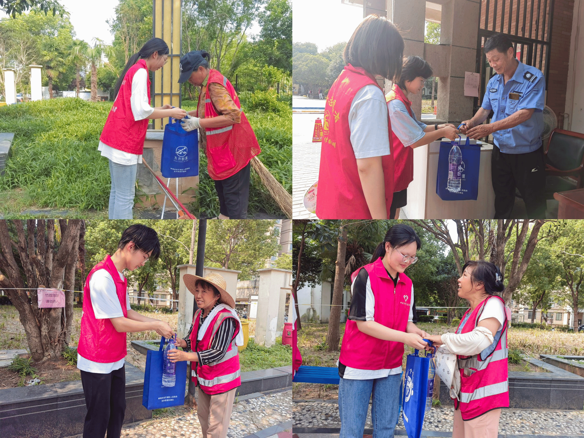 活动中,“慰问环卫工人” 环节尽显人文温度。队员们将饮用水、藿香正气水、毛巾等物资送到环卫工人手中,亲切交流工作日常,感谢他们顶烈日维护社区洁净。从事环卫工作 10 年的阿姨感动地说:“孩子们的关心让再苦再累都值了。” 这不仅是物资传递的温暖,更是青年对基层劳动者的尊重与共情,是实践育人中 “厚植情怀” 的生动写照。