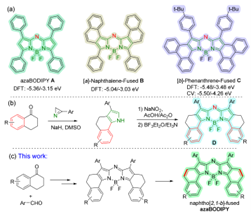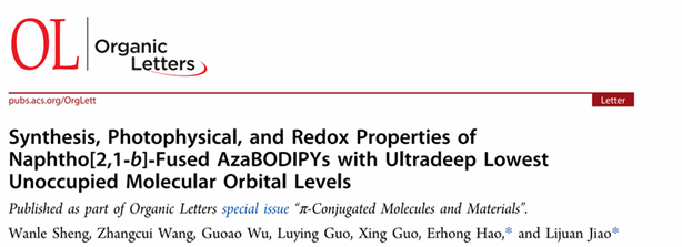 azaBODIPY分子进行并环衍生可以调控分子能级,使分子光谱发生红移。然而目前构建并环azaBODIPY的方法相对较少。基于此,我校公共基础学院药物合成教研室盛万乐博士聚焦于该领域研究,在《Organic Letters》(中科院1区,TOP期刊,IF=5.0)杂志上发表题为“Synthesis, Photophysical, and Redox Properties of Naphtho[2,1b]Fused AzaBODIPYs with Ultradeep Lowest Unoccupied Molecular Orbital Levels”的最新研究成果。论文第一作者为我校公共基础学院盛万乐博士,安徽师范大学焦莉娟、郝二宏教授为论文通讯作者。该研究得到了国家自然科学基金、安徽省自然科学基金和蚌埠医科大学龙湖英才项目的资助。