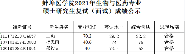 蚌埠医学院2021年生物与医药专业硕士研究生复试(面试)成绩公示