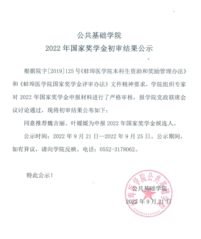 公共基础学院2022年本科生国家奖学金初审结果公示