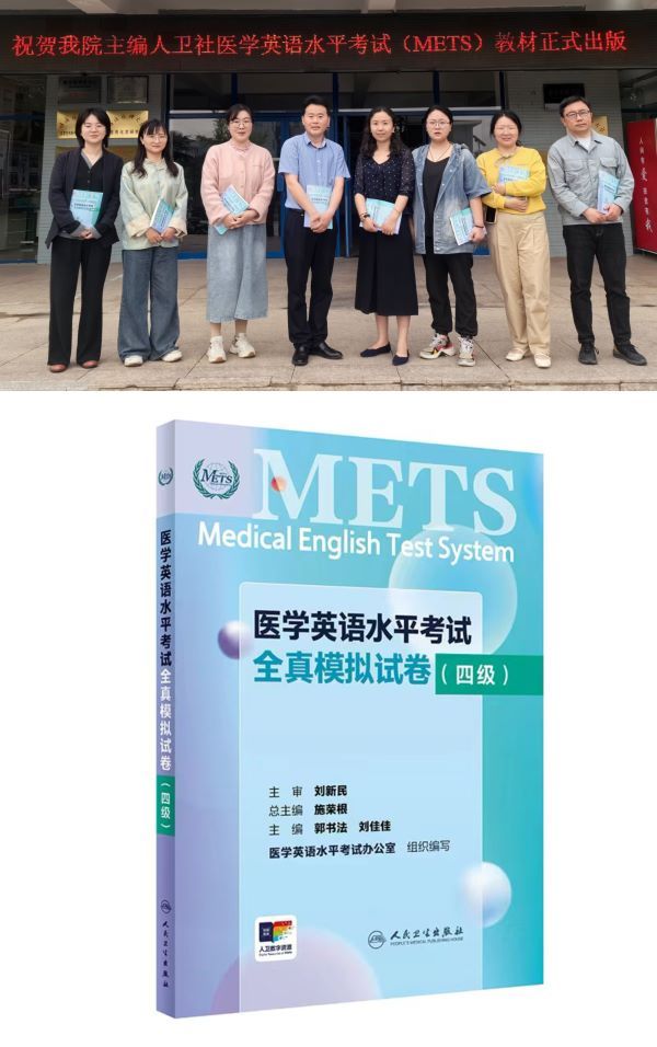 由医学英语水平考试办公室和人民卫生出版社委托公共基础学院省级专业英语教学团队负责编写的《医学英语水平考试全真模拟试卷(四级)》正式出版。该书自2023年6月启动编写以来,依托我校省级新医科外语课程思政虚拟教研室,联合中国医科大学、北京协和医学院、大连医科大学、昆明医科大学、山西医科大学、温州医科大学和安徽医科大学等7所医科大学的资深医学英语教师共同完成编写任务。作为主编单位,公共基础学院省级专业英语教学团队共有8位老师参加了编写工作。